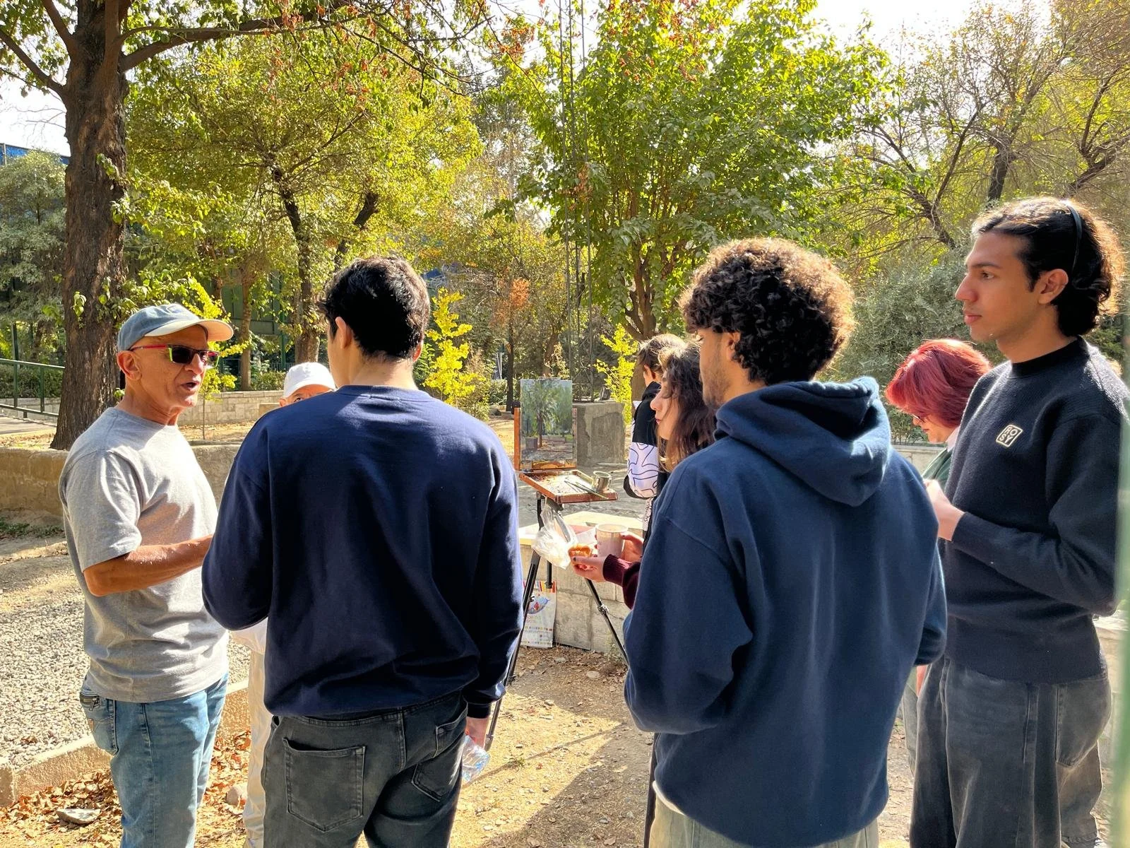 While in Iran in October, I had the opportunity to share my work and participate in a demonstration with a group of second-year art students from the University of Tehran. It was a lovely day, with the sun out, and after meeting the students, I felt the enthusiasm and positive vibes emanating from their presence. They brought their own paintings from outdoor work they had done, and I randomly gave them some insight to use as tools that I believed would inspire them to continue in their version of the art world. There were about twenty students who joined me, along with their professor and his assistant. We wandered the grounds of the University, as I was looking for something that would strike my fancy to paint. Not surprisingly, since I always gravitate toward trees, there was a lone tree with a shimmering light that caught my attention. I wanted to demonstrate the relationship between warm and cool colors in creating a good color perspective, so this seemed like the perfect tree to use as an example. The crowd and I had a stimulating interaction during the demo in the late autumn morning. It was after the demo that I reflected on how decisive decision-making, in the stroke of the paintbrush, can lead to a painting that I am proud to show on my walls, and even more proud to share with others who will enjoy it. It also dawned on me how decisive and sound decision-making can also affect every aspect of one’s life. It is not who is lucky and who is not fortunate, but rather it is how one mindfully navigates the decisions we make on a daily basis. I am happy that I decided to spend my morning at the University with so many talented students.